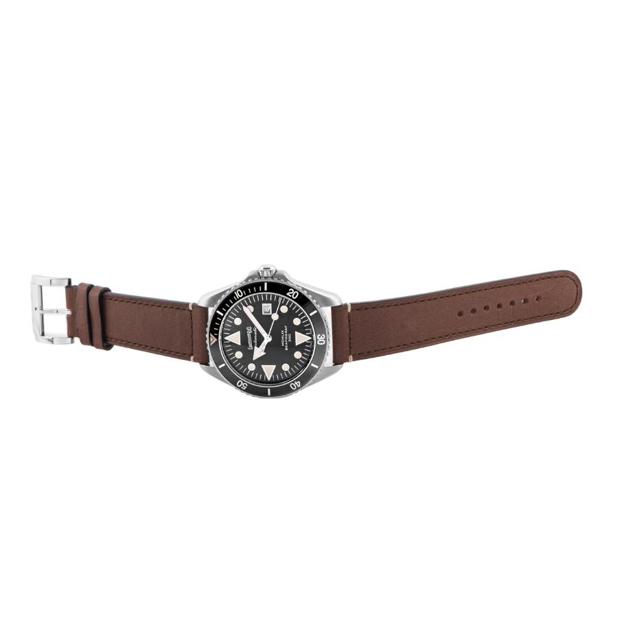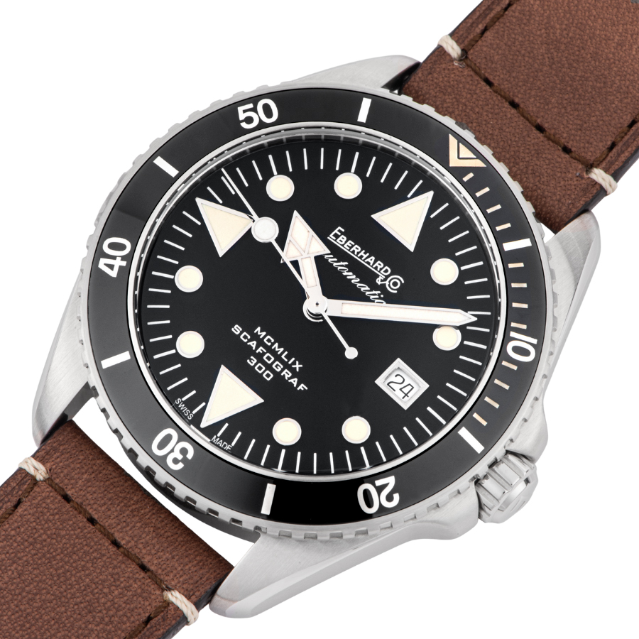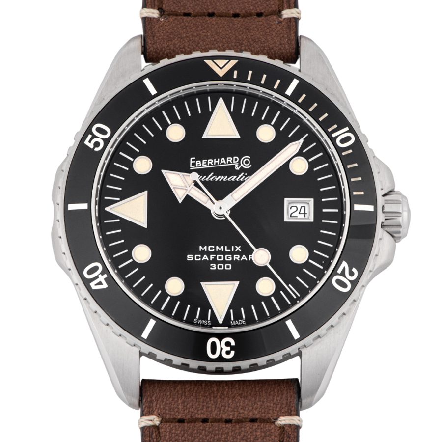 | 商品説明 | ☆1959年に誕生したエベラール初の本格ダイバーズ「スカフォグラフ」。その歴史的モデルを 現代的に再構築したのが、この"MCMLIX"と名付けられた復刻モデルです。 印象的な三角形の時針に加え、インデックスは丸と三角を組み合わせたクラシカルな意匠。視認性を追求しながらも、レトロな雰囲気を色濃く残したデザインに仕上がっています。 300m防水に加え、ヘリウムエスケープバブルも装備されており、ハードな環境にも対応。43mmケースは存在感がありつつも厚みは約12.6mmと抑えられ、手首への収まりも良好です。撥水加工を施したヴィンテージ調レザーストラップが、ツール感に上品な表情を添えています。 歴史あるダイバーズの名作を、日常に馴染む1本として楽しめる、エベラールならではの復刻モデルです。 表示価格は現金価格となります。 通常ローンはご利用いただけます。 |