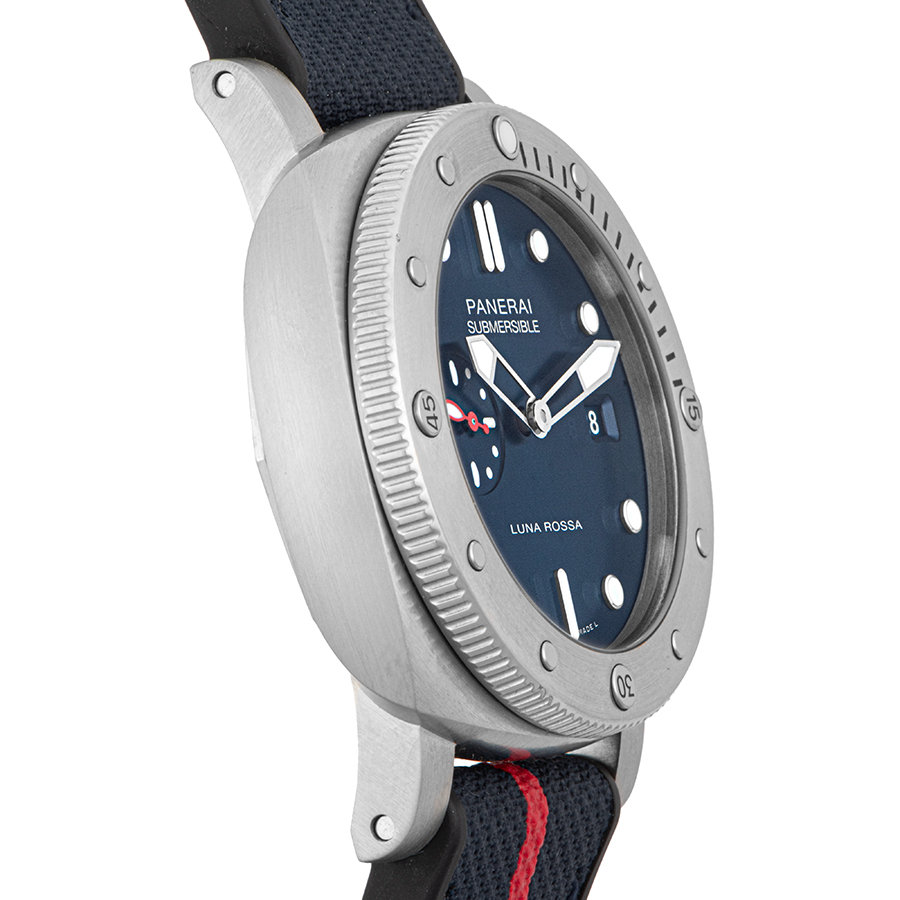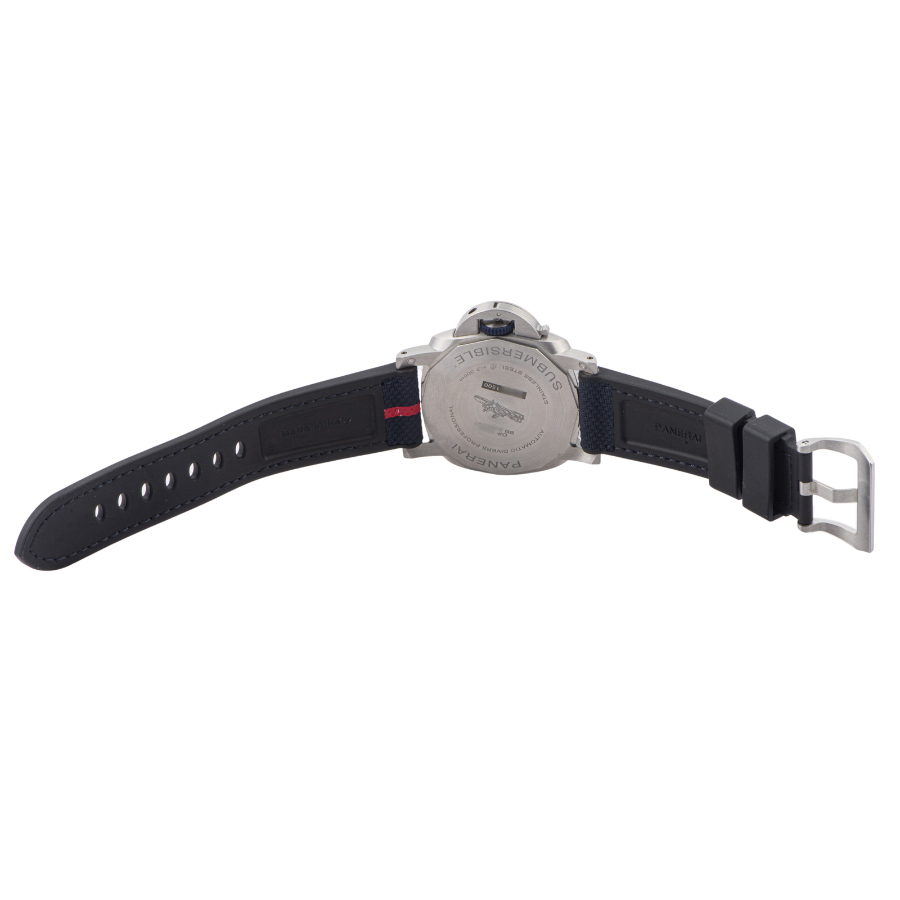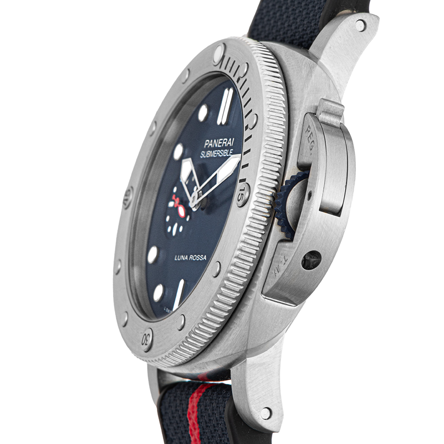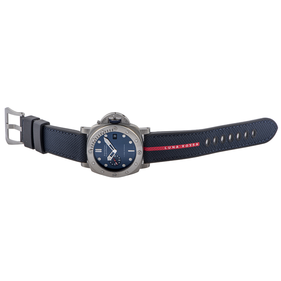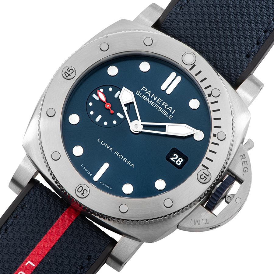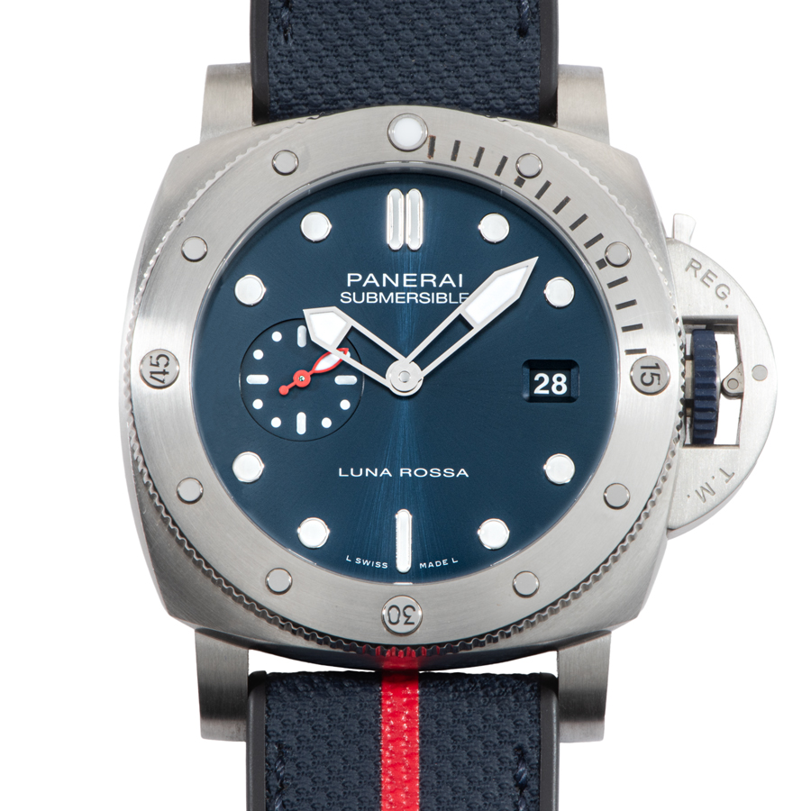 | 商品説明 | ☆パネライのパートナーであるイタリアのヨットチーム「ルナロッサ・プラダ・ピレリチーム」のアメリカズカップ出場を記念し、1500本の限定品として発売されたモデルです。 ダイヤルのブルーカラーに合った、赤いラインに白のルナロッサ ロゴがアクセントになったダークブルーのバイマテリアルストラップが特徴的なデザインとなっています。 |