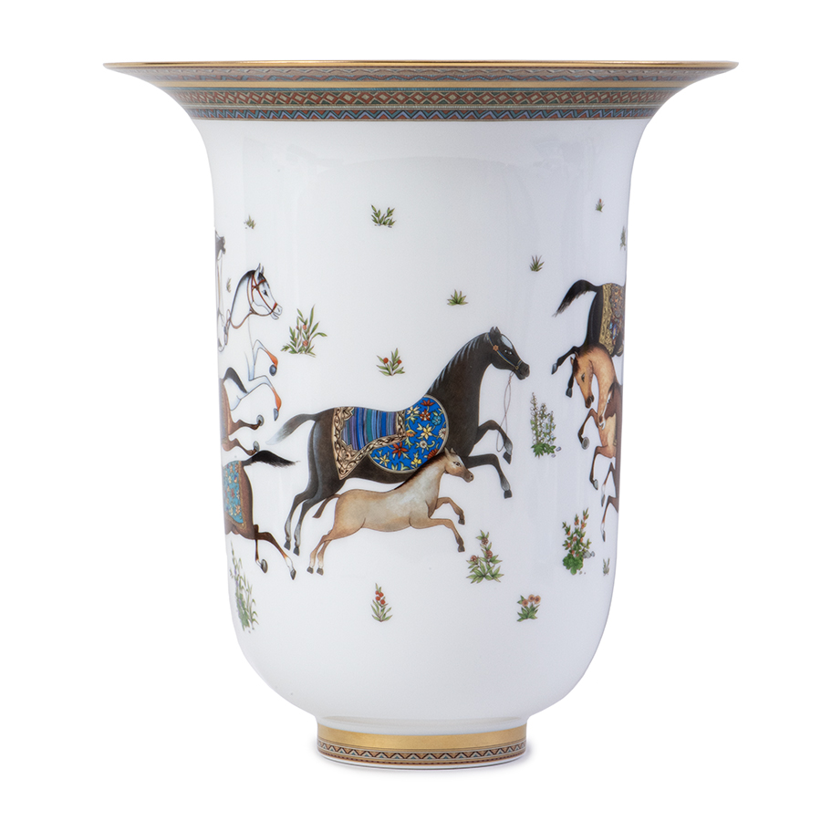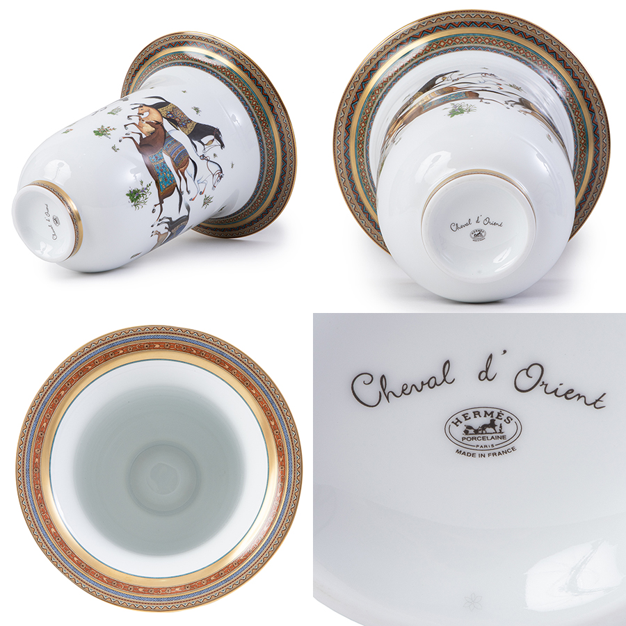 | 商品説明 | ☆エルメスの花瓶「Cheval d Orient(シュヴァルドリアン)」です。 シュヴァルドリアンはフランス語で東洋の馬という意味で、ふんだんに施された手書きの金彩が目をひく、どこかエキゾチックな雰囲気漂うシリーズです。 東洋と西洋を行き交ったシルクロードのキャラバン隊や、独特の文化と活気を感じさせてくれます。 特別な記念日に心を込めた上品な贈り物、お祝いのギフトやプレゼントとしてもオススメです。 表示価格は現金価格となります。 通常ローンはご利用いただけます。 |