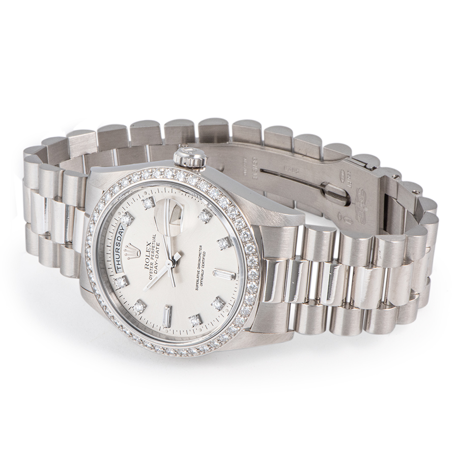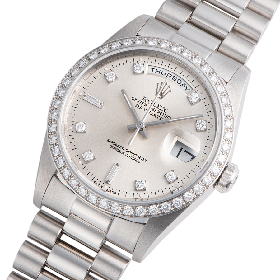 | 商品説明 | ☆1956年の登場以来、ロレックスのトップラインとして名声を確立している「デイデイト」。 ベゼルにもダイヤモンド、シルバーダイアルに8Pダイヤ、2Pバケットダイヤをセッティングした華やかなモデルです。 ※外装仕上げ済みです。 ケース本体には目立つ大きな傷や致命的なダメージはありません。 ブレスの鏡面仕上げ部分に使用に伴う打ち傷がありますが、年代を考慮していただければコンディション大きな問題は御座いません。 表示価格は現金価格となります。 通常ローンはご利用いただけます。 |